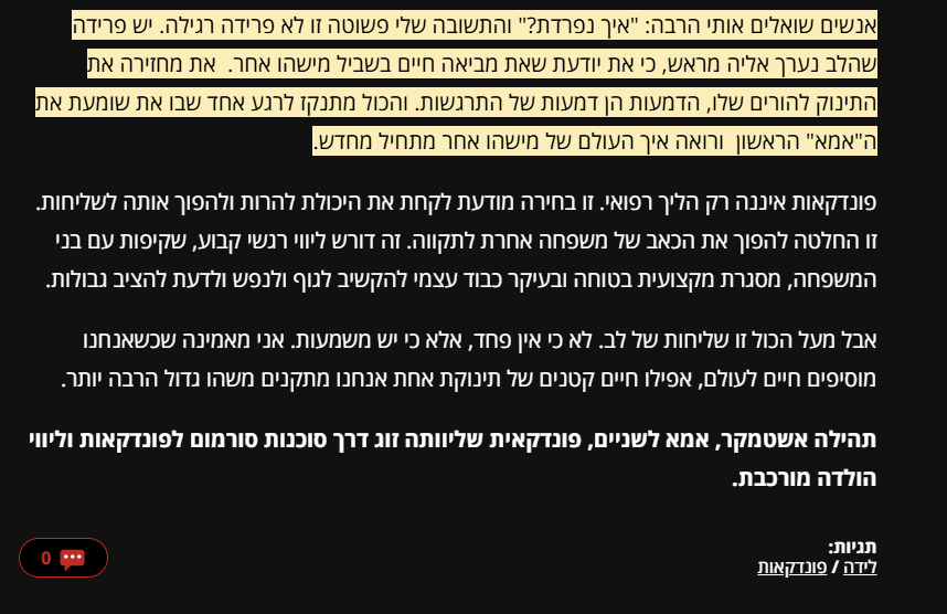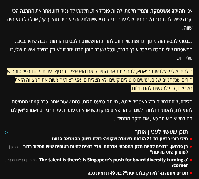 טור חשוב במעריב של אידה בראון מנכ"לית מרכז סורמום לפונדקאות בארץ ובעולם בהקשר לחוק הפונדקאות והבחירות הקרבות בישראל וזוגות חד מיניים וגברים יחידניים.