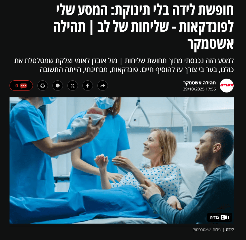 כתבה באתר ערוץ 13 שנכתבה על ידי אידה בראון המנכ"לית שלנו לגבי הליך פונדקאות בחו" ובארץ לזוגות סטרייטים או לחד מיניים ויחידנים